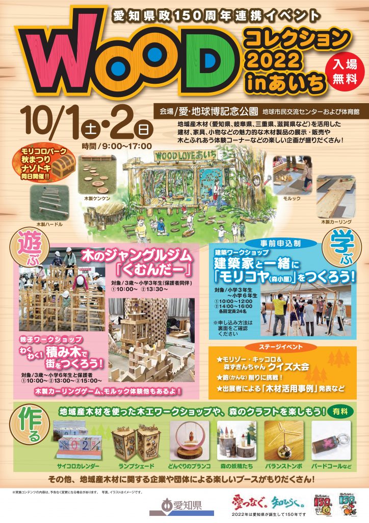 愛知県は、地域材利用促進と林業・木材産業振興のためのイベント「WOODコレクション2022 in あいち」を10月1、2日に愛・地球博記念公園地球市民交流センター体育館(愛知県長久手市)で開催。